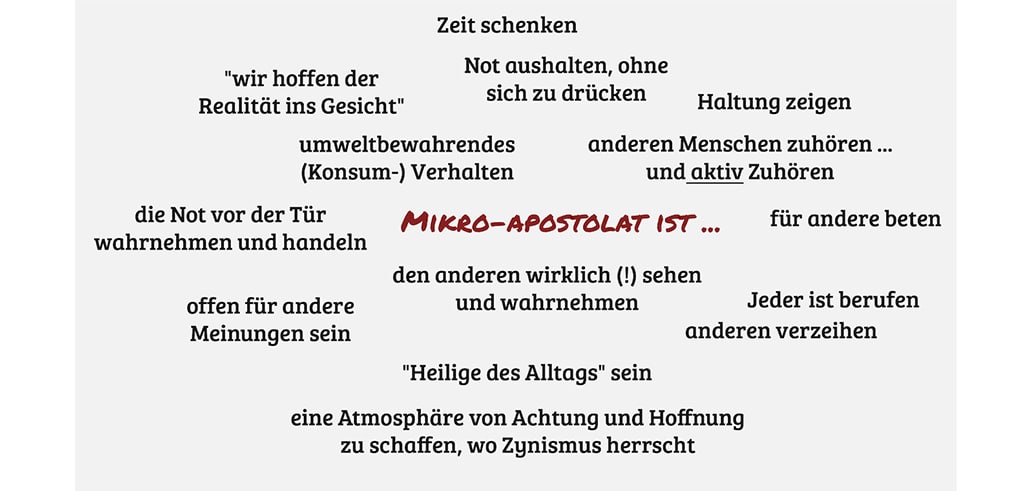 Ein Apostel zu sein ist dabei in mehrfacher Hinsicht gar nicht so einfach. Denn was ist das überhaupt – ein Apostel? Jünger, Nachfolger, Follower… und wie verbindlich ist das gemeint? Welche sind die „Mindestanforderungen“ und wie darf ich meine eigenen, bescheidenen Versuche und Bemühungen dabei bewerten? Wie erfahre ich, ob ich auf einem guten Weg bin? Fragen über Fragen, über die wir uns Gedanken gemacht haben. Dazu wählten wir den Begriff des „Mikroapostolats“.