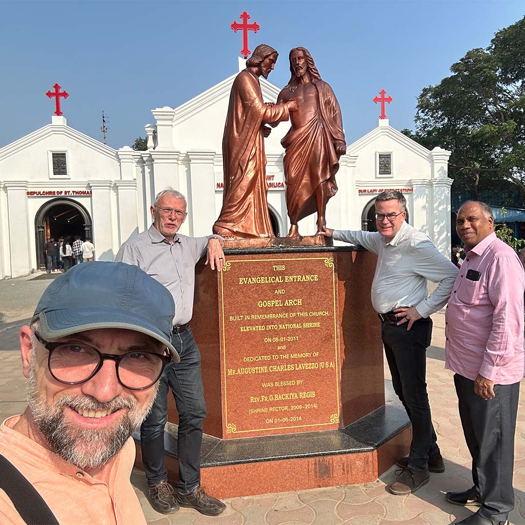 Nach einer langen Anreise (Flug von München über Bombay nach Chennai sowie langen Wartezeiten) war unsere erste Station Chennai, wo unsere Mitbrüder eine Pfarrei und eine Schule betreuen. Dort besuchten wir auch den Mount St. Thomas, wo der Legende nach der Apostel Thomas sein Martyrium erlitten hat.