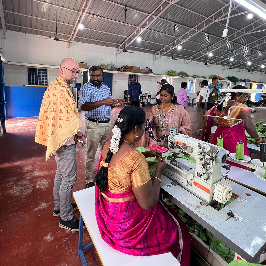 Am nächsten Tag fuhren wir – nach dem Frühstück im Ausbildungshaus „Pallotti Illam“ – zu Pater Selvaraj, der zwei Stunden von Pillar entfernt ein „Tailoring Center“ leitet, das nach dem Seligen Pater Richard Henkes benannt ist. Dort arbeiten 50 Frauen, die unterschiedliche Schneiderarbeiten ausführen können. Auch hier erwartete uns auf dem Rückweg wieder eine besondere Erfahrung: eine Begegnung mit Nomadenvölkern, die in einem abgelegenen Dorf immer wieder Station machen und in ärmsten Verhältnissen leben. Auch hier versuchen die Pallottiner durch Unterricht und Bildung zu helfen.