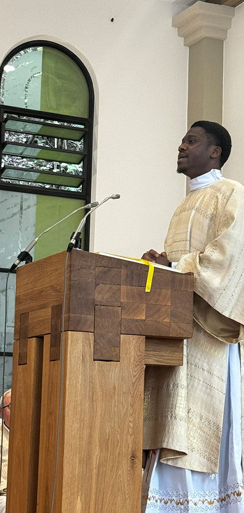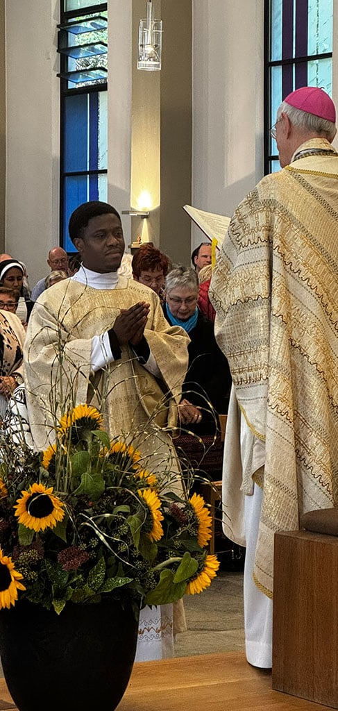 Der neue Diakon, 1987 in Lagos geboren, hatte nach längerer Berufssuche zunächst in seiner nigerianischen Heimat und dann in Kamerun Philosophie und Theologie studiert. Hier lernte er die Gemeinschaft der Pallottiner und ihr Kirchenbild kennen. Nach Gesprächen mit dem damaligen Provinzial, Pater Helmut Scharler, kommt er 2020 nach Friedberg und absolviert dort sein Noviziat. Im Oktober 2022 wechselt er an Haus Wasserburg, hilft mit in der „Offenen Jugendarbeit“ in Vallendar, in der Kursarbeit im Bildungshaus und studiert online Gesundheitspsychologie und Medizinpädagogik. Damit will er sich für seine spätere Tätigkeit in der Seelsorge qualifizieren. An Vinzenz Pallotti beeindruckt ihn, dass dieser keinen Unterschied gemacht habe zwischen Priestern und Laien, Gläubigen und Atheisten. Ihm war wichtig, „dass du Mensch bist“. Auf diesem Hintergrund wolle er Menschen in der Seelsorge begleiten.