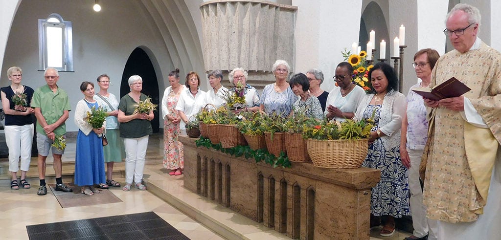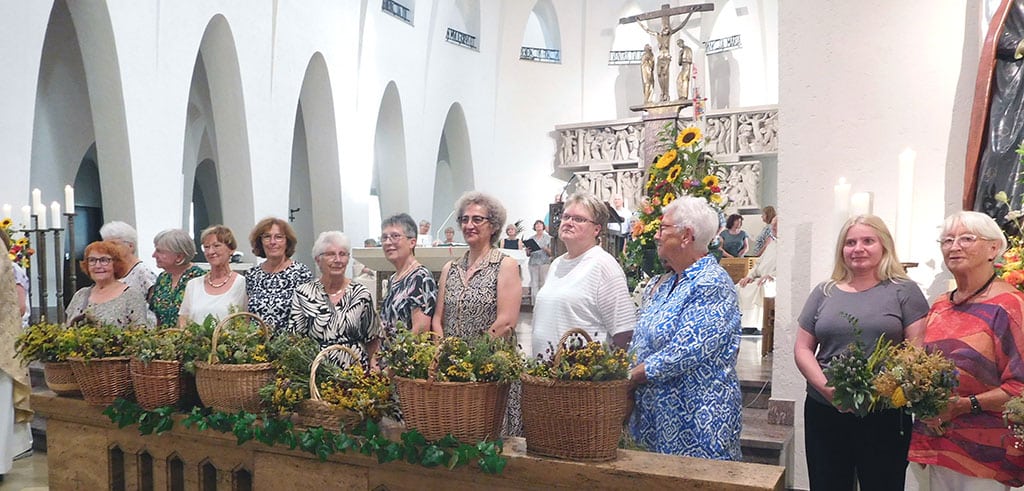Dass alle in dem gut besuchten Gottesdienst einen Kräuterstrauß mit nach Hause nehmen konnten, dafür sorgte die Frauengemeinschaft von St. Marien. Fleißige Hände ihrer auf 38 Mitglieder angewachsenen Gruppe hatten Salbei, Ringelblumen, Thymian, Zitronenmelisse, Rosmarin, Fenchel, Basilikum, Spitzwegerich, Johanniskraut und viele andere Pflanzen zusammengetragen und weit über 200 Sträuße gebunden. Sie verbreiteten in 15 prall gefüllten Körben vor dem Altar einen betörenden Duft. Zusätzlich waren viele Gläubige mit eigenen Gebinden zur Segnung durch Pater Holzbach erschienen. Den Frauen wurde am Ende der heiligen Messe mit großem Applaus für ihren Dienst gedankt.