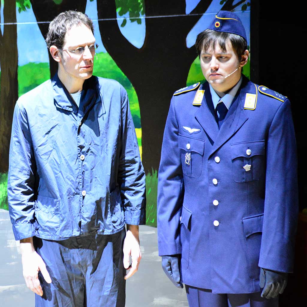 Die große Stärke des Reinisch-Musicals zeigte sich in den musikalisch wie szenisch verdichteten 23 Liedern: Quasi als „Vorwort“ schickte Röhrig das Lied „In der Achterbahn“ voraus, in dem als Stimme aus dem Off Amin Jan Sayed von „Demagogen“ und „Selbstverzichtern ohne Rückgrat“, aber auch „kollektivem Wahn“ sang und so einen klaren Bezug zu aktuellen Fake-News-Zeiten und vermeintlichen Rettern des Abendlands herstellte.