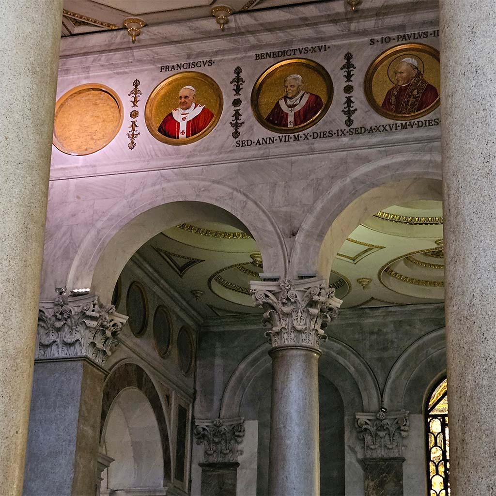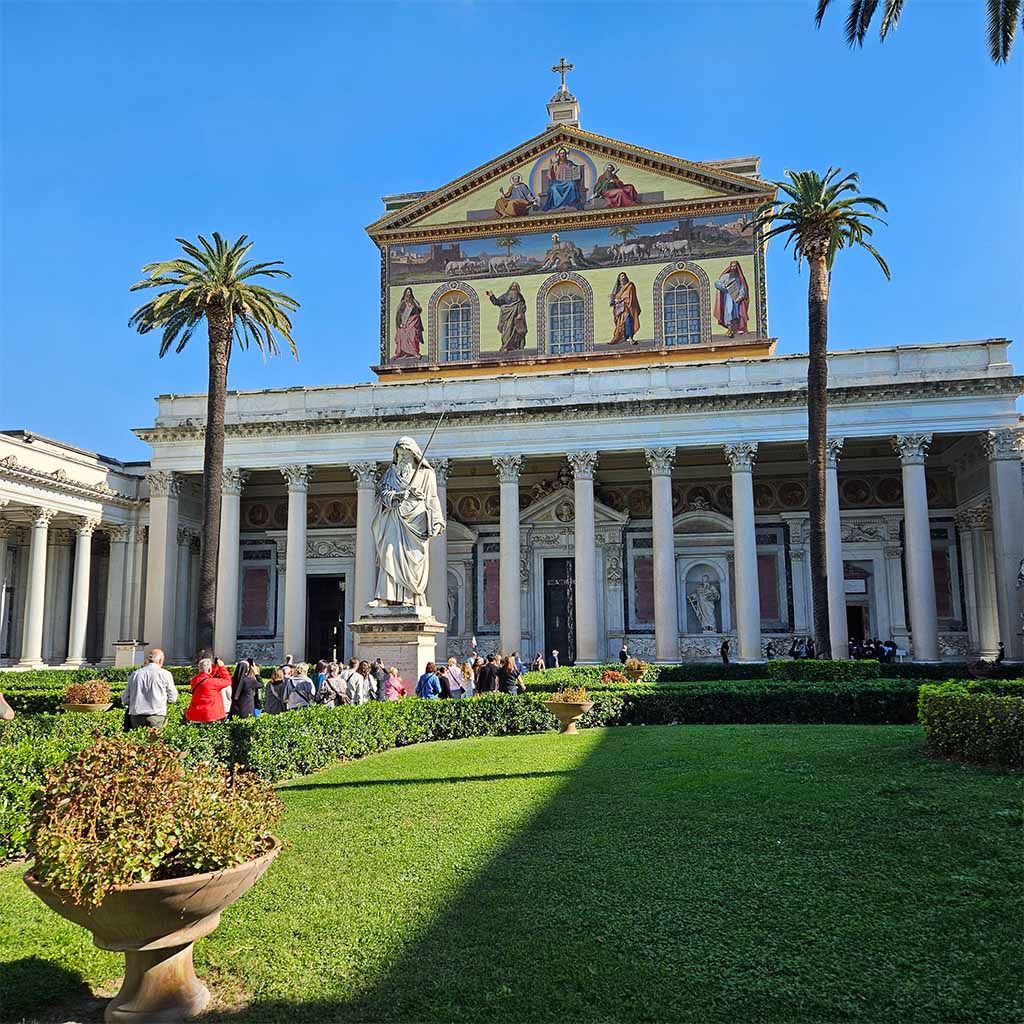 Sowohl bei der großen Marienkirche als auch bei Sankt Paul vor den Mauern haben wir die Heiligen Pforten betend und singend durchschritten und Gnade und Hoffnung in uns gespürt. In Santa Maria Maggiore sahen wir auch das Grab von Papst Franziskus und beteten dort mit sehr vielen Menschen. In Sankt Paul betrachteten wir die Bildnisse aller Päpste; das Porträt von Leo XIV. ist allerdings noch nicht angebracht. Am Grab des Völkerapostels Paulus verharrten wir im Gebet.